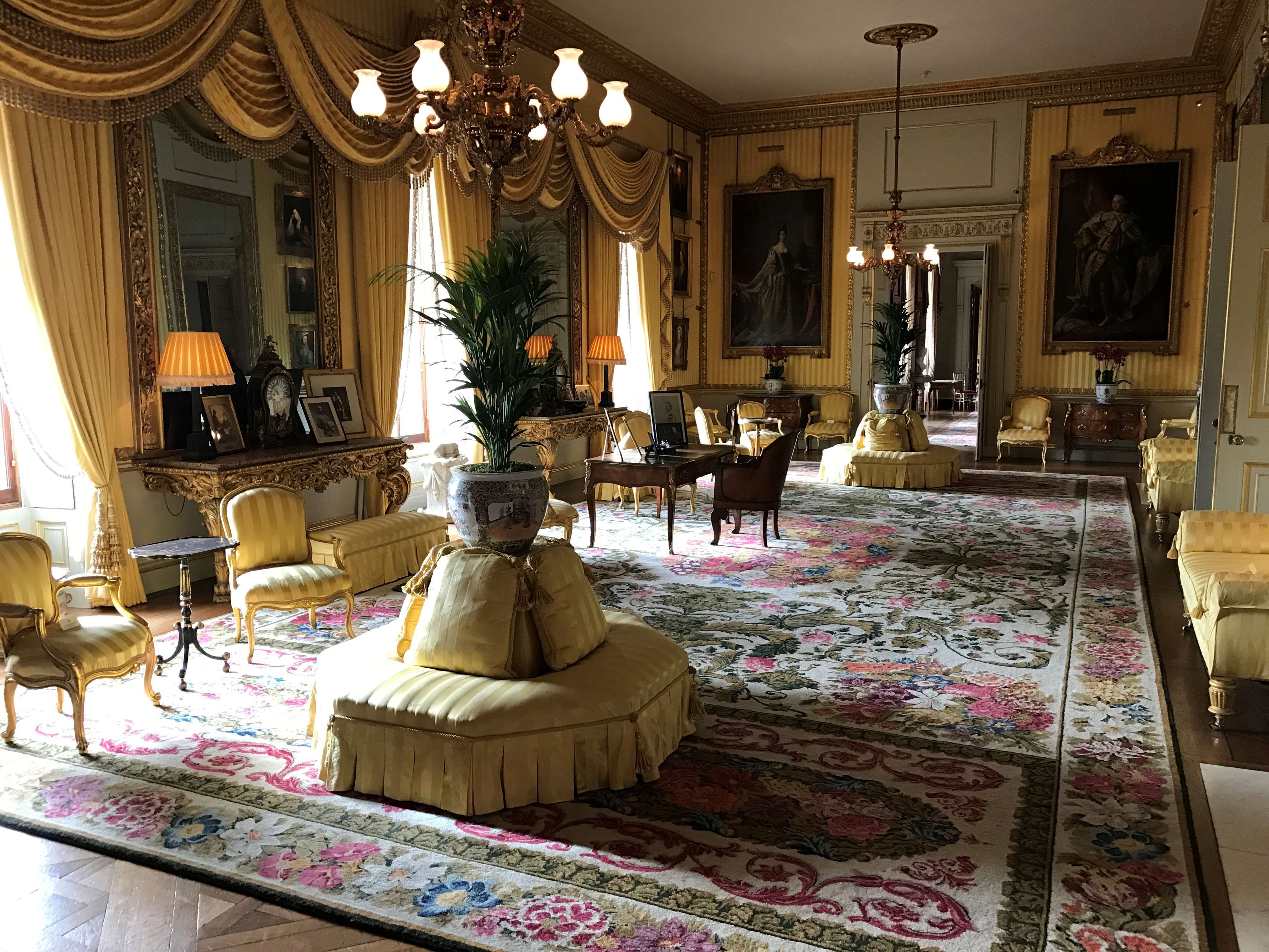 This beautiful reception room at Goodwood House is adorned with rich yellow silk and elegant Regency furnishings, which create an opulent, sumptuous interior. Elaborate French furniture sits alongside full-length royal portraits of King George II and III and the room features floor-to-ceiling windows, which flood the room with natural light.
