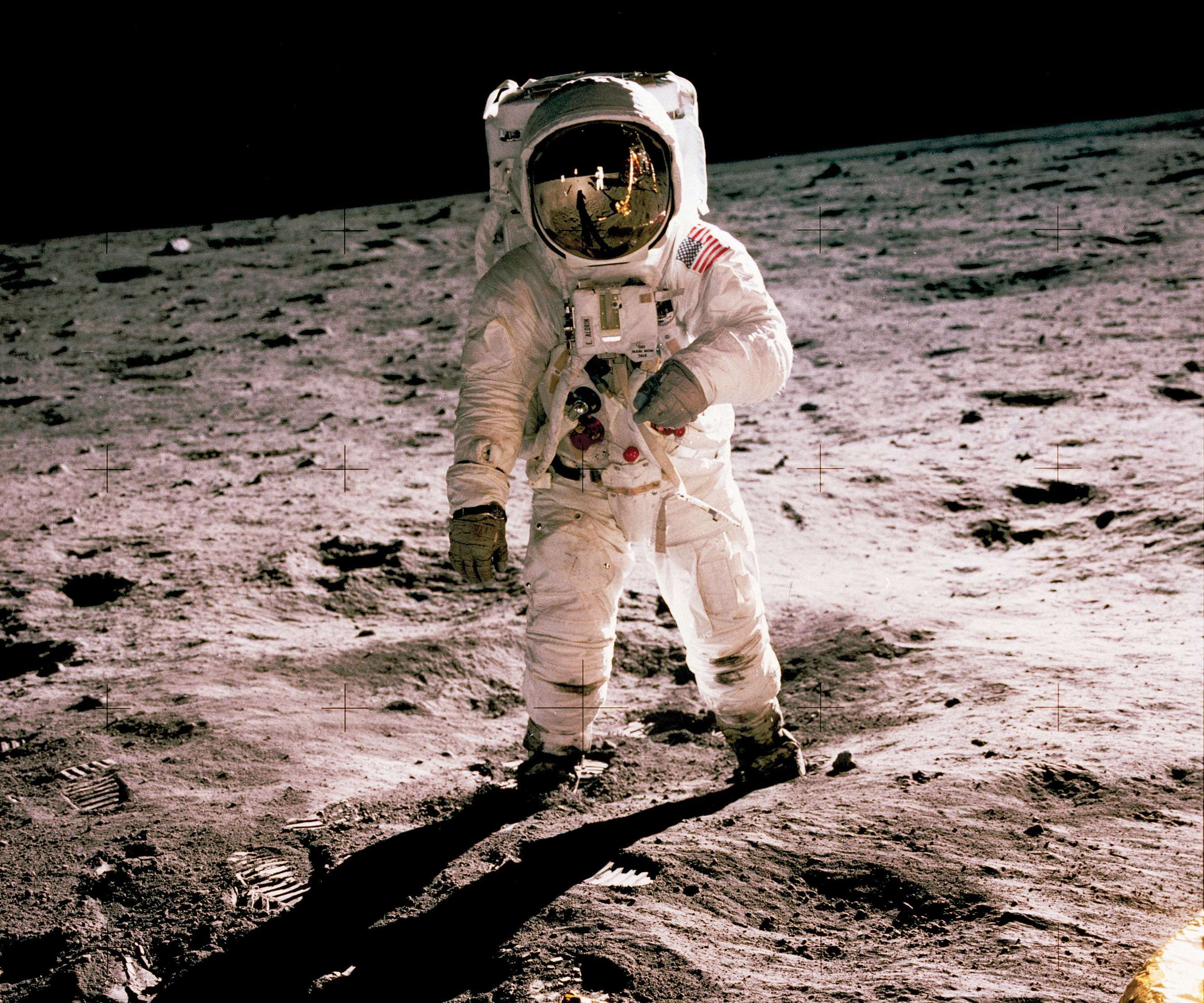Buzz Aldrin walks on the Moon. Neil Armstrong, who took the photo, can be seen reflected in his helmet.