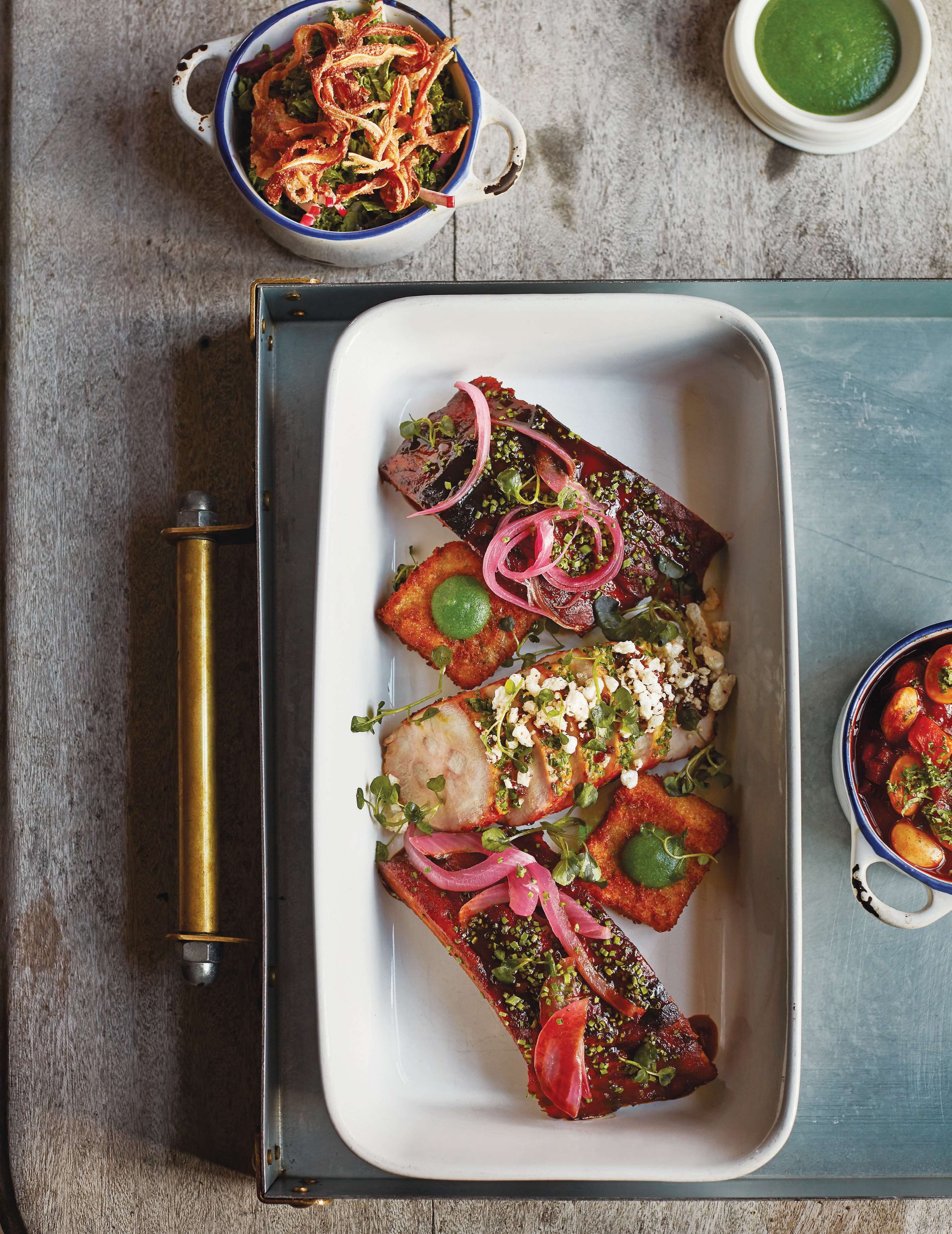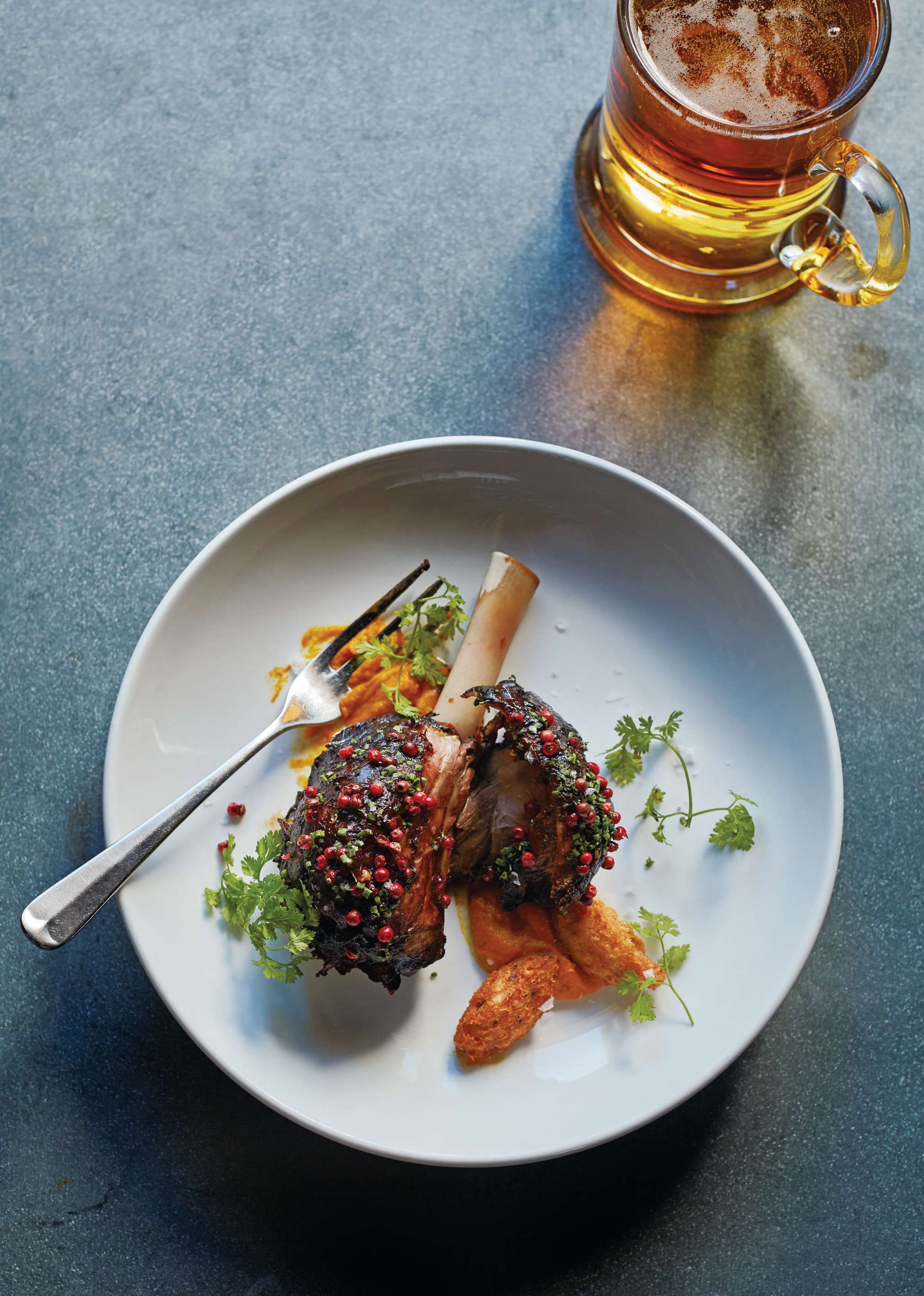 Broadly speaking, Smith explains, when choosing beer to go with food, you use a similar rule of thumb to when choosing wine. Paler beers and lagers go well with seafood and chicken; but the darker the meat, the darker the beer. A hoppy beer cuts through and complements the fattiness of a rib-eye, for example. Goodwood’s new St. Simon Lager “has a distinctly bread-y flavour”, says Smith, which makes it a perfect beer to enjoy alongside ham and pork. Or rather a little bit of everything porky, from belly to tail, as in the pork “butcher’s board” (actually a blacksmith’s tray) – a sharing dish from Farmer, Butcher, Chef. The beer is named for St. Simon, the Thoroughbred that won the 1883 Goodwood Cup – and then, famously, wouldn’t stop running, long after crossing the finishing line.