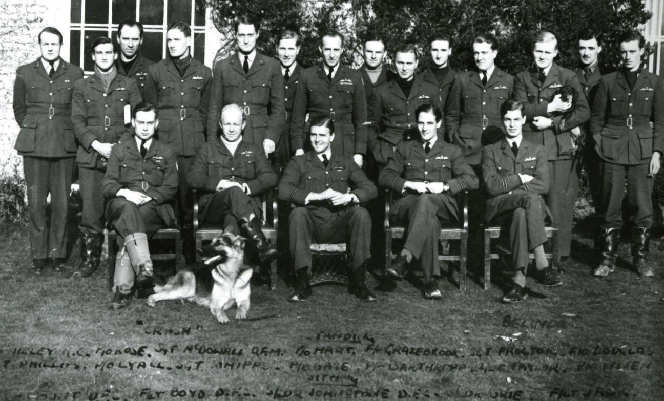 The earliest known dog of 602 Squadron during September 1940 onwards was that of Pilot Officer Patrick ‘Paddy’ Barthropp who flew during the Battle of Britain from the airfield. His dog was a dachshund called Blitzkrieg, the squadron also has an Alsatian called ‘Crash’ and another dog called Mr Jackson, a small terrier. They roamed the dispersals of the squadron and appear in the squadron photograph.