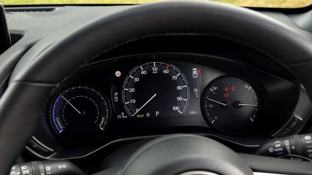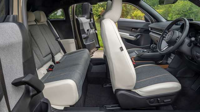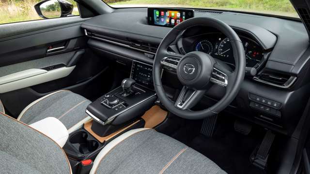 The list of standard features on the MX-30 is compact but sensible. The two screens – seven-inch touch and 8.7-inch top – are included on all MX-30s as are front and rear parking sensors, powered mirrors, a reversing camera, rain-sensing wipers, DAB radio, Apple Carplay, Android Auto, bluetooth, blindspot monitoring, lane keep assist and a head-up display.