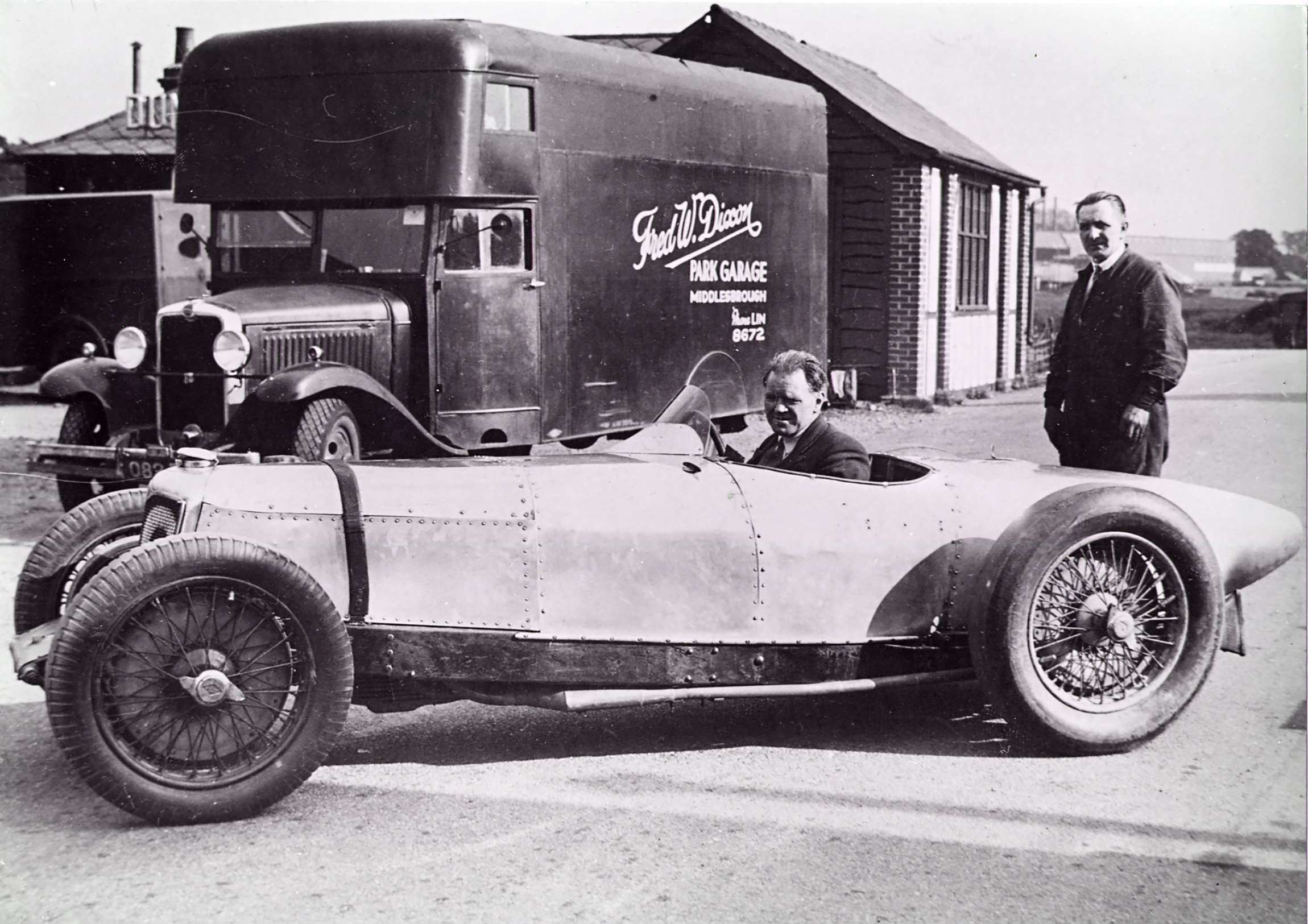 Brooklands - gruff and tough no-nonsense TT winner on both two wheels and four - Freddie Dixon, from Middlesbrough, in his very special Riley 9...