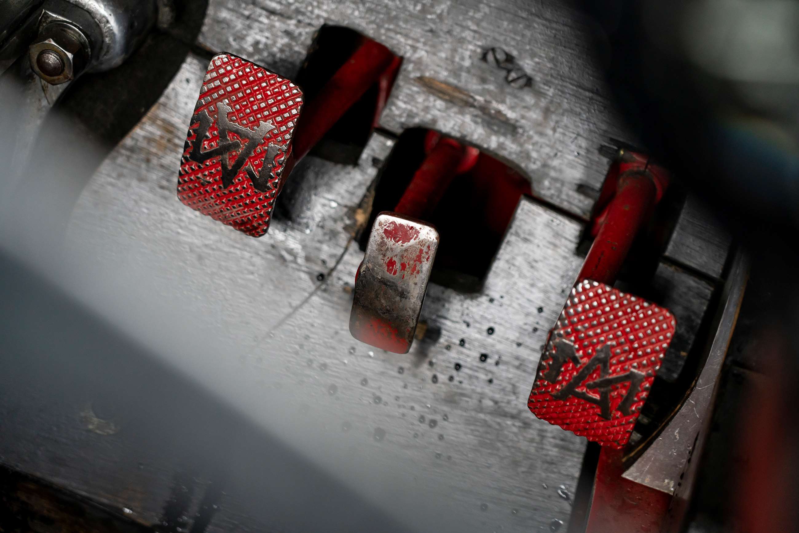 You sit low and close to the wheel which flexes in your hands. The pedals are short travel and even with big feet there's space enough to avoid pressing one without the others. "I think centre throttles are just the best," says Blakemore as we hurtle round. Then it's my turn and I'm not so sure I agree as the rain beats harder and the track disappears under water.