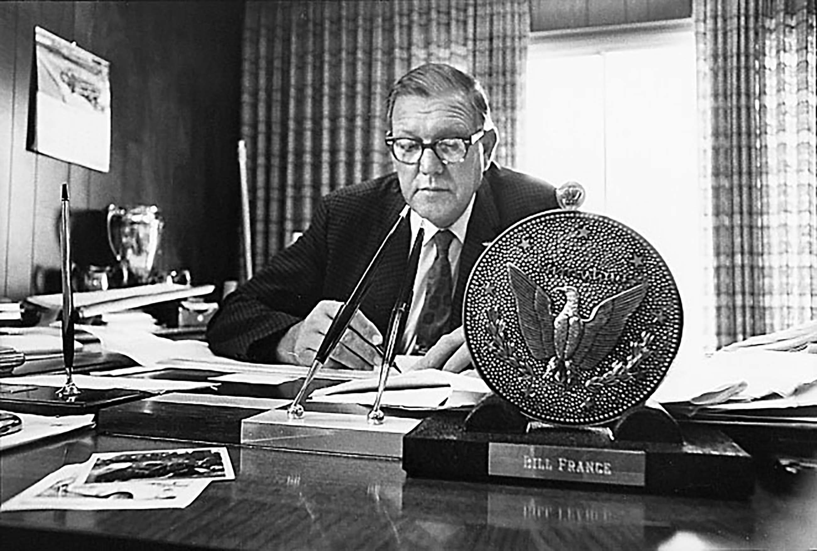 When in 1969 rising speeds and delaminating tyres caused a twitchy Professional Drivers Association, led by Richard Petty, to walk from the first Grand National race at his 200mph track at Talladega, Alabama, France broke the strike with a field of mainly second-tier drivers.
